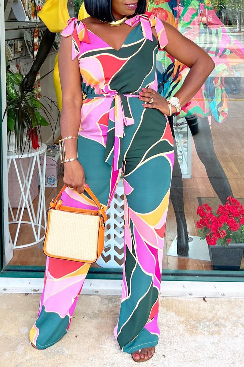 Colour Casual Daily Color Lump Bandage V Neck Straight Jumpsuits