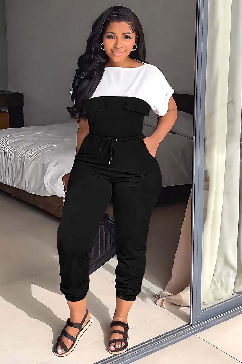Colorblock Short Sleeve Tie Up Pocket Jogger Pants Jumpsuit
