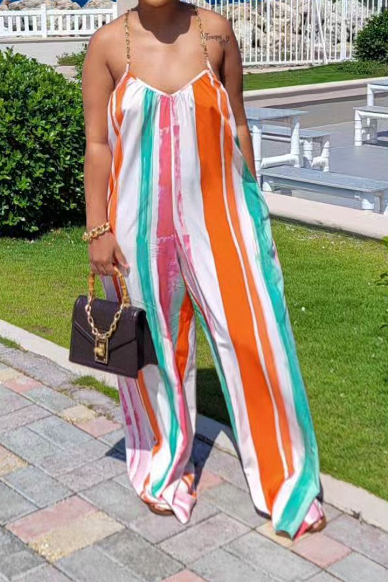 Colour Casual Simplicity Striped Printing Contrast Spaghetti Strap Straight Jumpsuits