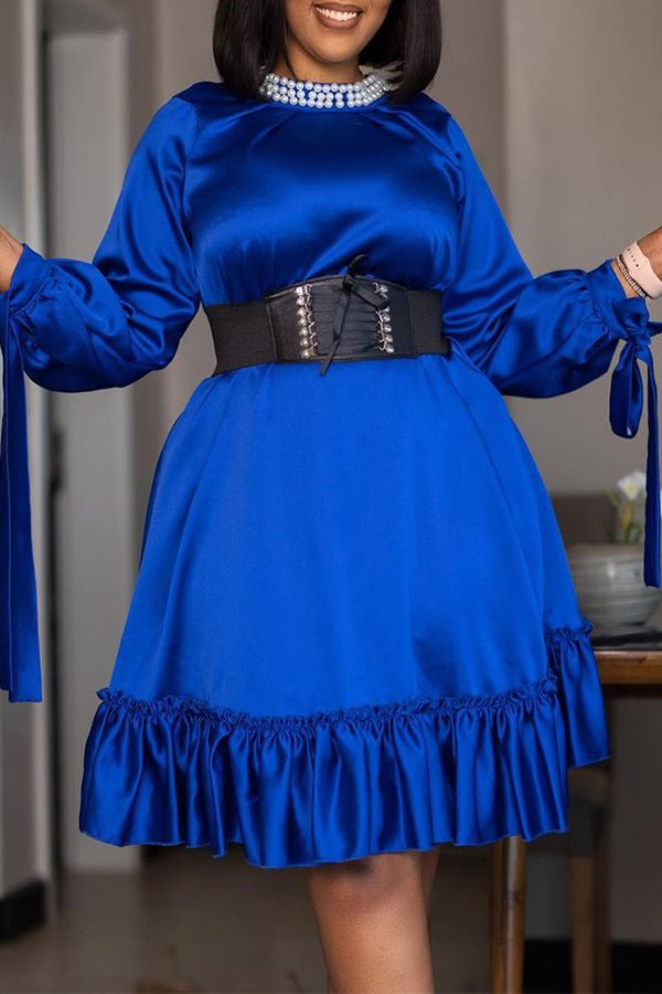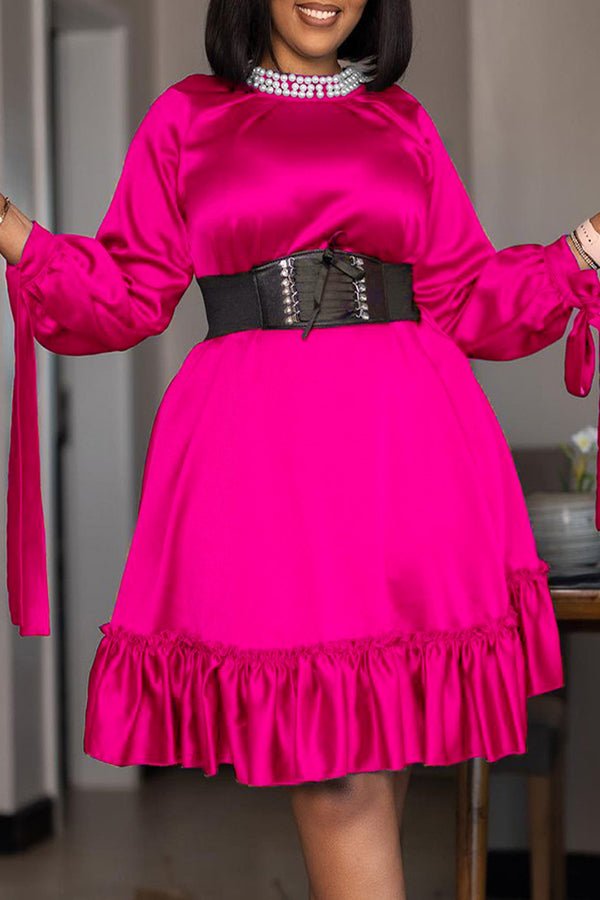 Pearl Neck Ruffle Hem Satin Dress (With Belt)