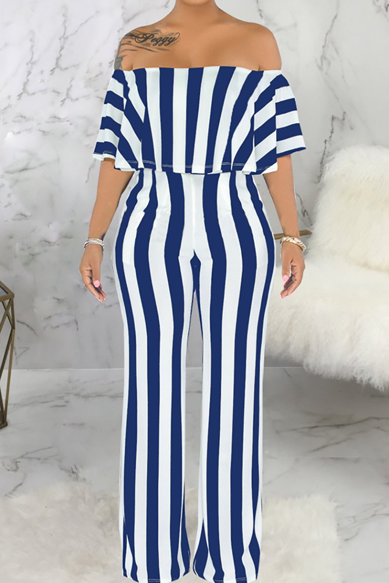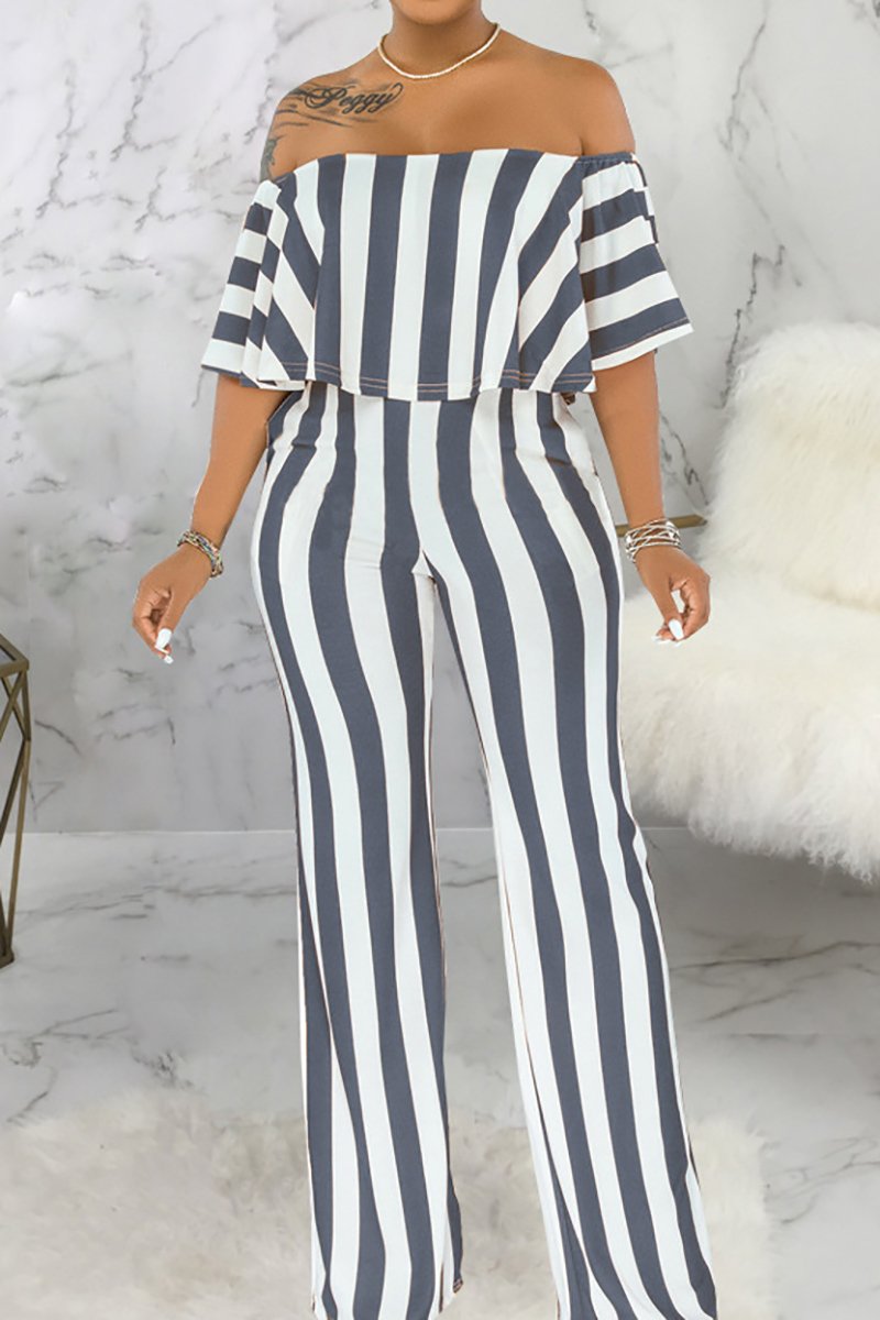 Off Shoulder, Short Sleeve, Boat Neck, Backless, Bodycon, Striped Jumpsuit.