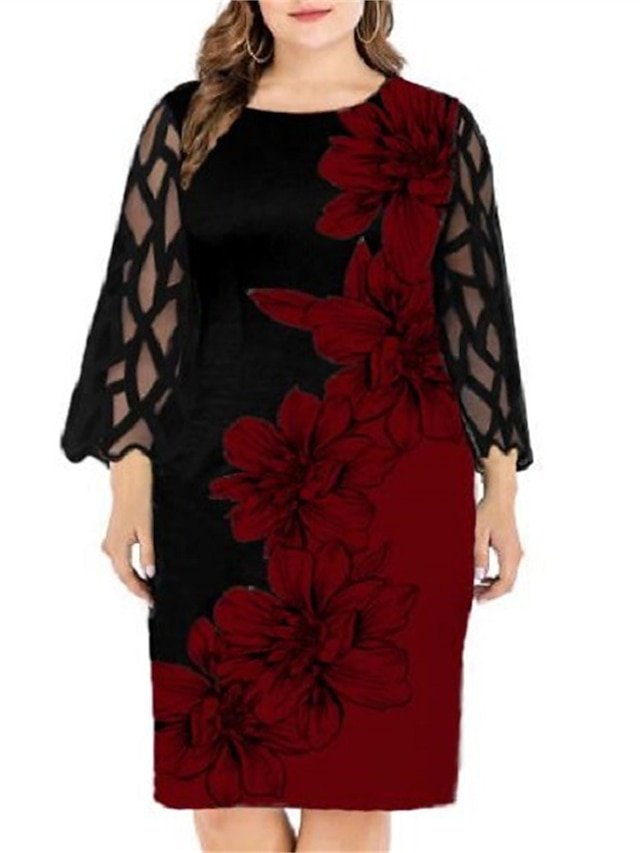 Women’s Plus Size Work Dress Shift Dress Floral Midi Dress 3/4 Length Sleeve Lace Print Crew Neck Fashion Office Black Wine Summer Spring L XL XXL 3XL 4XL