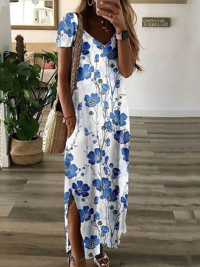 Women’s Long Dress Maxi Dress Casual Dress Shift Dress Summer Dress Floral Fashion Streetwear Outdoor Daily Vacation Pocket Split Short Sleeve V Neck Dress Loose Fit White Blue Light Sky Blue Summer #9542267